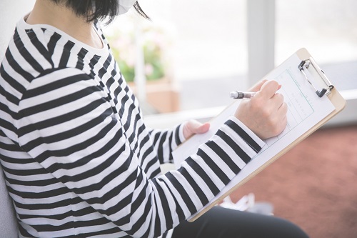 まず最初に問診票をご記入ください。現在の症状、これまでの経過、既往歴などを書いていただきます。